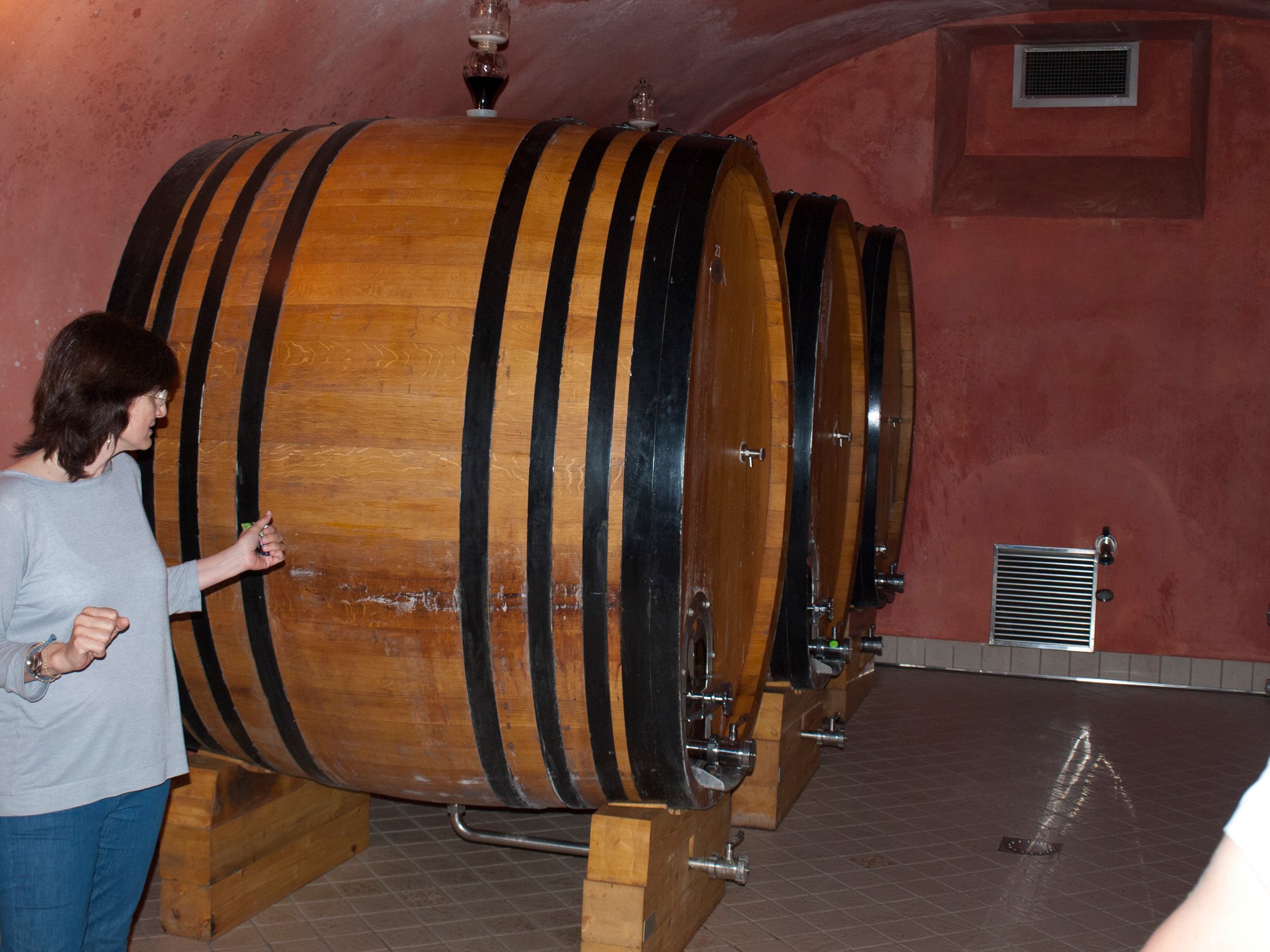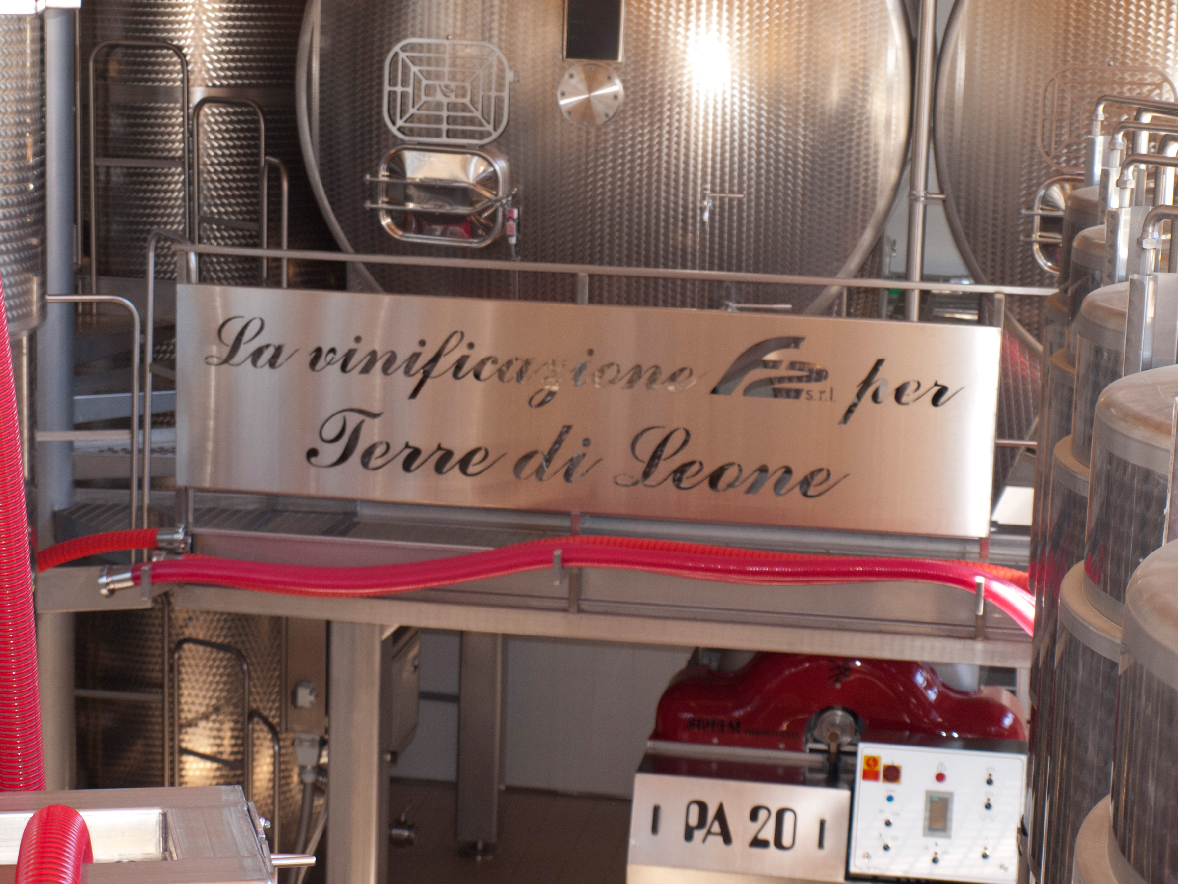 Die ganz besondere Philosophie der beiden zeigt sich in vielen Beispielen. Sie versuchen immer so naturnah wie möglich zu produzieren, versuchen Maschineneinsatz zu vermeiden wo es geht und greifen manchmal auch zu ungewöhnlichen Maßnahmen. Die Maschine zum Pressen der Trauben z.B. ist eigentlich keine Maschine. Hier kommt nur die Schwerkraft und ein wenig Handarbeit zum Einsatz. Diese Gerätschaft wurde extra für Terre di Leone konstruiert und gebaut. Oder die Tonneau: Die großen Fässer (25hl) wurden aus französischer Eiche gefertigt. Chiara und Federico reisten dazu eigens in den französischen Forst und suchten persönlich die Bäume aus.